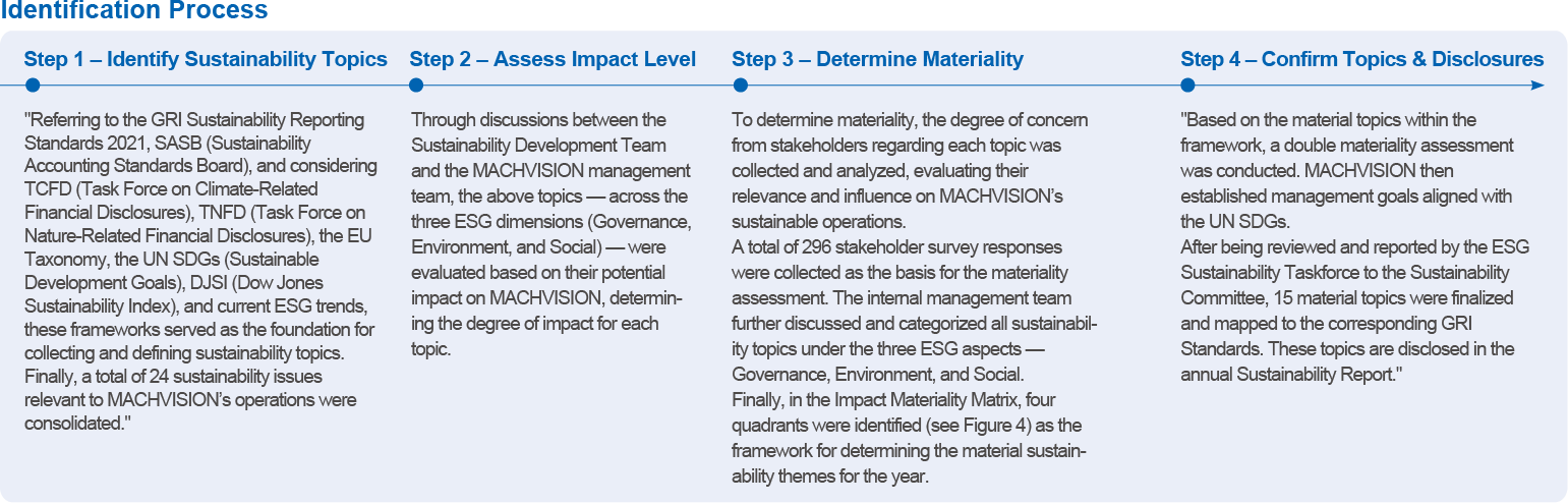 This process aims to identify sustainability topics of concern to internal and external stakeholders, evaluate their influence on MACHVISION, and define the scope and boundaries of sustainability disclosures. By continuously enhancing sustainability performance and information transparency, the Company can implement effective measures to achieve its sustainable development goals.
